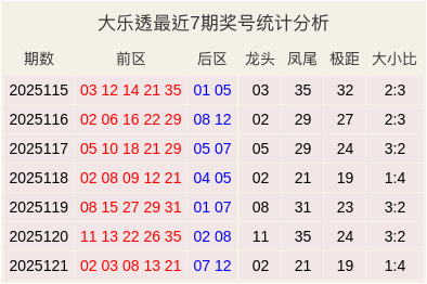 上期大乐透的开奖号码中,龙头凤尾组合为02+21,极距为19,大小比为1:4。