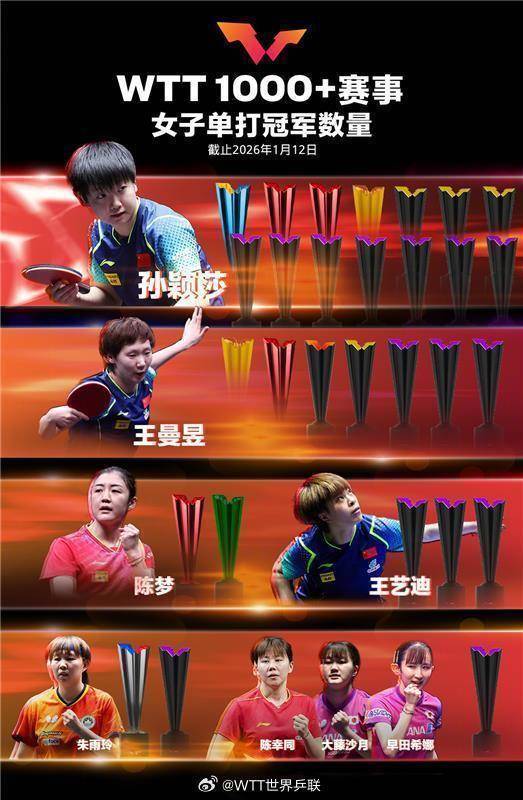 原标题:WTT1000+冠军榜更新,王楚钦、孙颖莎分列第一