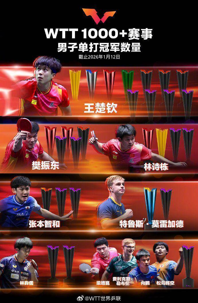 须眉单打冠军数目,王楚钦、樊振东、林诗栋位列前三;女子单打冠军数目,孙颖莎、王曼昱、陈梦位列前三。
